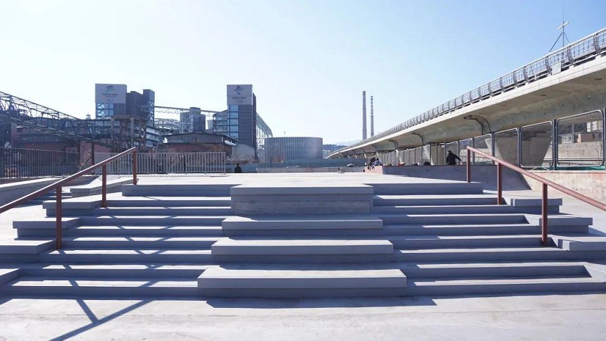 首鋼滑板公園位于北京石景山區,距離地鐵一號線西端的蘋果園站大概3站地的距離,項目總占地面積17913平米,其中滑板區、攀巖區各占地約4000平方米,這個新建的滑板場屬于國內大型場地。