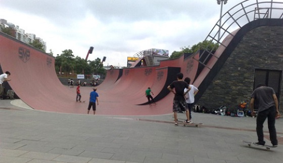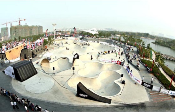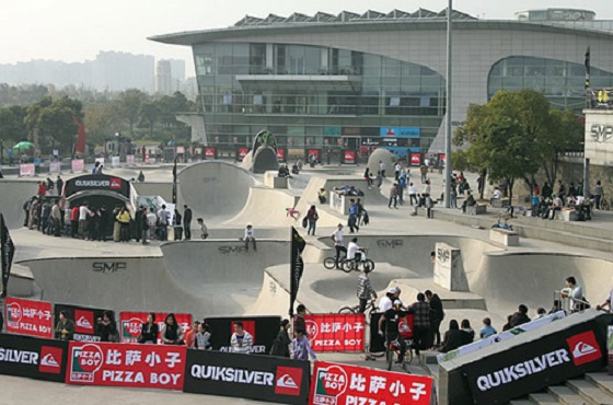 新江灣城SMP滑板公園擁有深度從 一米 到近 六米 的七個(gè)形狀各異的碗池、世界最大 四十六米 長(zhǎng)的 U 型槽、世界級(jí)的街區(qū)以及可容納近三千名觀眾的露天體育廣場(chǎng)。