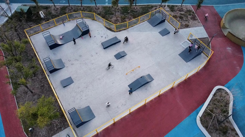 廣闊的滑板場地設計別具匠心,800多平面的街式場地區域、U型槽、小弧坡、小斜坡、雙斜坡、大小出發臺、大小拋出臺、跳箱、盒子、跳桿、坡跳臺各種都有。彎曲的曲線道、陡峭的坡道和各種令人眼花繚亂的障礙設施,處處挑戰滑手們的技藝和勇氣。無論是新手還是經驗豐富的滑板高手,都能在這里找到適合自己的挑戰,一次又一次突破自我,感受成功的喜悅。